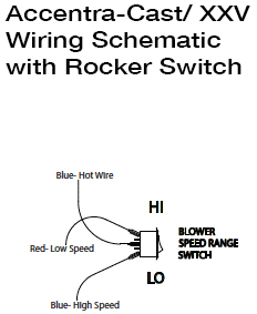 XXV/ Accentra-Cast units made without a rocker switch will ONLY have wires connecting for the Dark Blue and White. The spade on the motor for the red wire MUST be capped to prevent an accidental shorting of the circuit. Connecting a blank female wire terminal is the easiest way to do this.